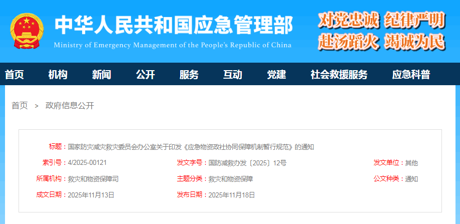 第二条 应急物资政社协同保障机制(以下简称政社协同机制)是国家防灾减灾救灾委员会办公室(以下简称国家防减救灾办)、应急管理部牵头建立,基金会、行业协会、社会服务机构、志愿服务组织等社会组织作为成员参与,根据自然灾害等重特大突发事件物资保障需要,在政府支持调拨应急抢险救灾物资基础上,规范开展社会援助捐赠物资的协同保障机制。根据保障需要,国家防减救灾办、应急管理部协调工业和信息化部、交通运输部、商务部、国家粮食和物资储备局、中国红十字会总会以及涉灾的省级有关部门等给予指导支持。