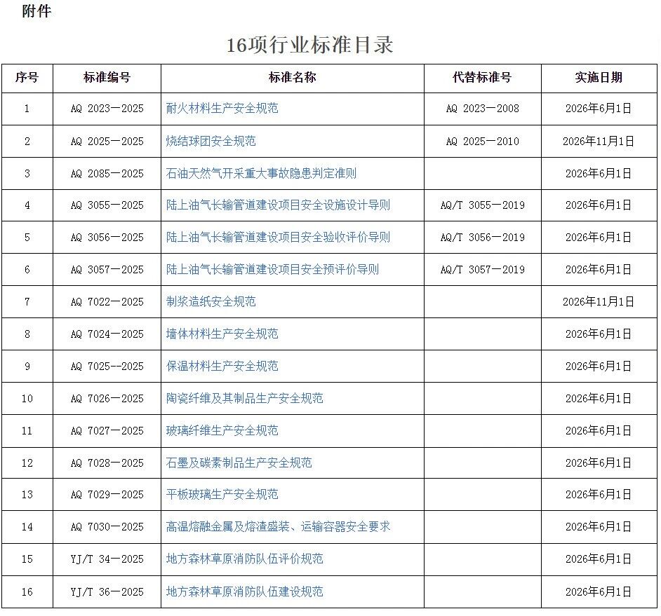 中华人民共和国应急管理部批准《耐火材料生产安全规范》等16项行业标准(标准文本附后),现予公布。