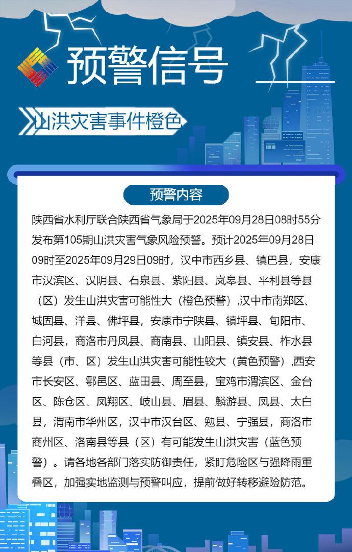 陕西省水利厅联合陕西省气象局于2025年09月28日08时55分发布第105期山洪灾害气象风险预警。预计2025年09月28日09时至2025年09月29日09时,汉中市西乡县、镇巴县,安康市汉滨区、汉阴县、石泉县、紫阳县、岚皋县、平利县等县(区)发生山洪灾害可能性大(橙色预警),汉中市南郑区、城固县、洋县、佛坪县,安康市宁陕县、镇坪县、旬阳市、白河县,商洛市丹凤县、商南县、山阳县、镇安县、柞水县等县(市、区)发生山洪灾害可能性较大(黄色预警),西安市长安区、鄠邑区、蓝田县、周至县,宝鸡市渭滨区、金台区、陈仓区、凤翔区、岐山县、眉县、麟游县、凤县、太白县,渭南市华州区,汉中市汉台区、勉县、宁强县,商洛市商州区、洛南县等县(区)有可能发生山洪灾害(蓝色预警)。请各地各部门落实防御责任,紧盯危险区与强降雨重叠区,加强实地监测与预警叫应,提前做好转移避险防范。