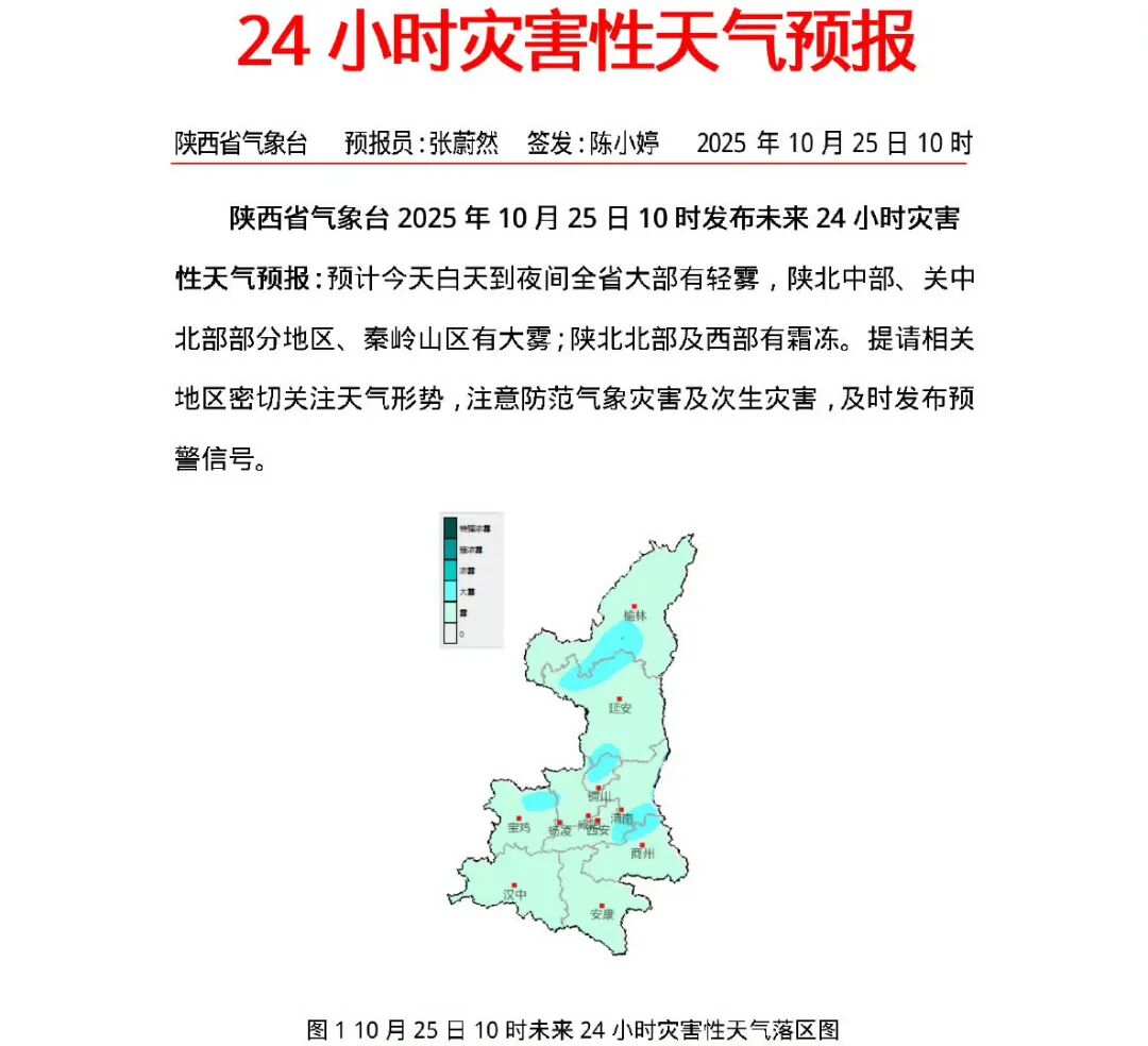 陕西省气象台 2025 年10月 25 日10 时发布未来 24 小时灾害性天气预报:预计今天白天到夜间全省大部有轻雾,陕北中部、关中北部部分地区、秦岭山区有大雾;陕北北部及西部有霜冻。提请相关地区密切关注天气形势,注意防范气象灾害及次生灾害,及时发布预警信号。