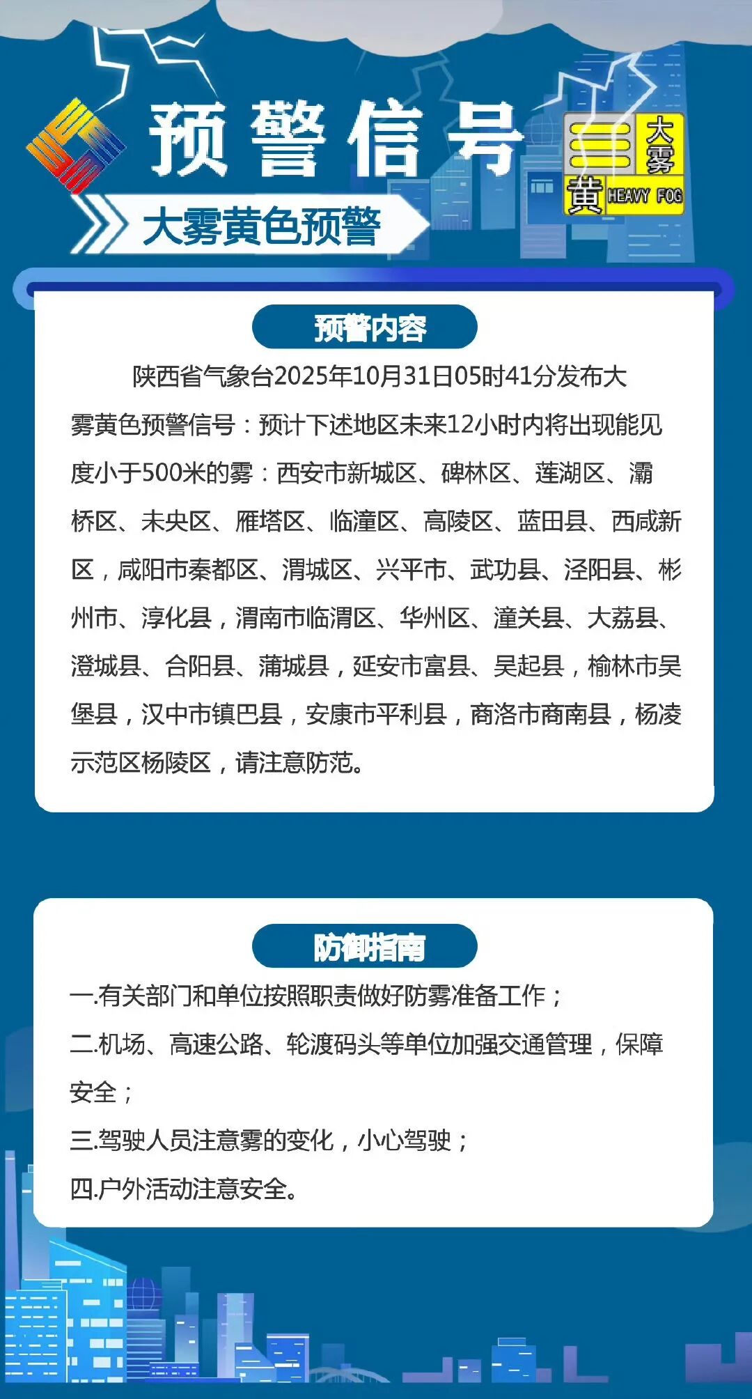 陕西省气象台2025年10月31日05时41分发布大雾黄色预警信号:预计下述地区未来12小时内将出现能见度小于500米的雾:西安市新城区、碑林区、莲湖区、灞桥区、未央区、雁塔区、临潼区、高陵区、蓝田县、西咸新区,咸阳市秦都区、渭城区、兴平市、武功县、泾阳县、彬州市、淳化县,渭南市临渭区、华州区、潼关县、大荔县澄城县、合阳县、蒲城县,延安市富县、吴起县,榆林市吴堡县,汉中市镇巴县,安康市平利县,商洛市商南县,杨凌示范区杨陵区,请注意防范。