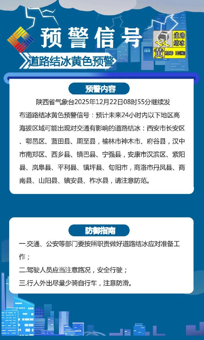 陕西省气象台2025年12月22日08时55分继续发布道路结冰黄色预警信号:预计未来24小时内以下地区高海拔区域可能出现对交通有影响的道路结冰:西安市长安区、鄠邑区、蓝田县、周至县,榆林市神木市、府谷县,汉中市南郑区、西乡县、镇巴县、宁强县,安康市汉滨区、紫阳县、岚皋县、平利县、镇坪县、旬阳市,商洛市丹凤县、商南县、山阳县、镇安县、柞水县,请注意防范。