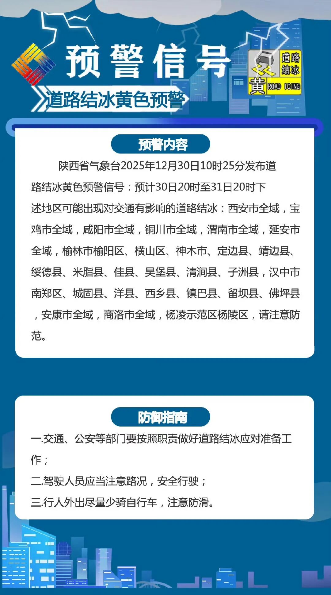 陕西省气象台2025年12月30日10时25分发布道路结冰黄色预警信号:预计30日20时至31日20时下述地区可能出现对交通有影响的道路结冰:西安市全域,宝鸡市全域,咸阳市全域,铜川市全域,渭南市全域,延安市全域,榆林市榆阳区、横山区、神木市、定边县、靖边县、绥德县、米脂县、佳县、吴堡县、清涧县、子洲县,汉中市南郑区、城固县、洋县、西乡县、镇巴县、留坝县、佛坪县,安康市全域,商洛市全域,杨凌示范区杨陵区,请注意防范。