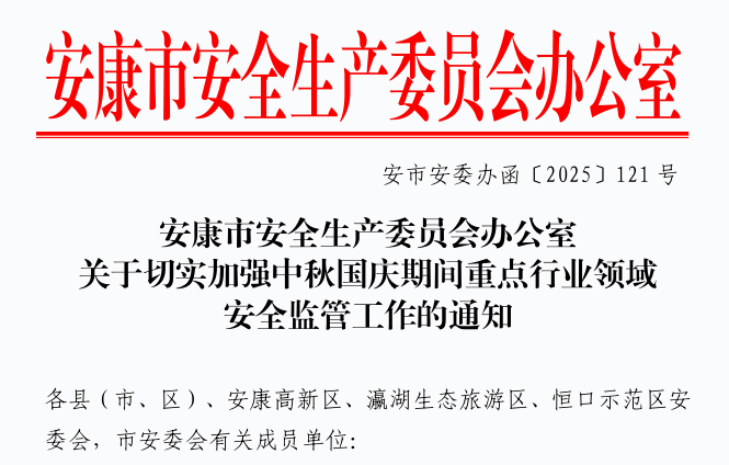 安康市安委办通知!加强中秋国庆期间重点行业领域安全监管工作