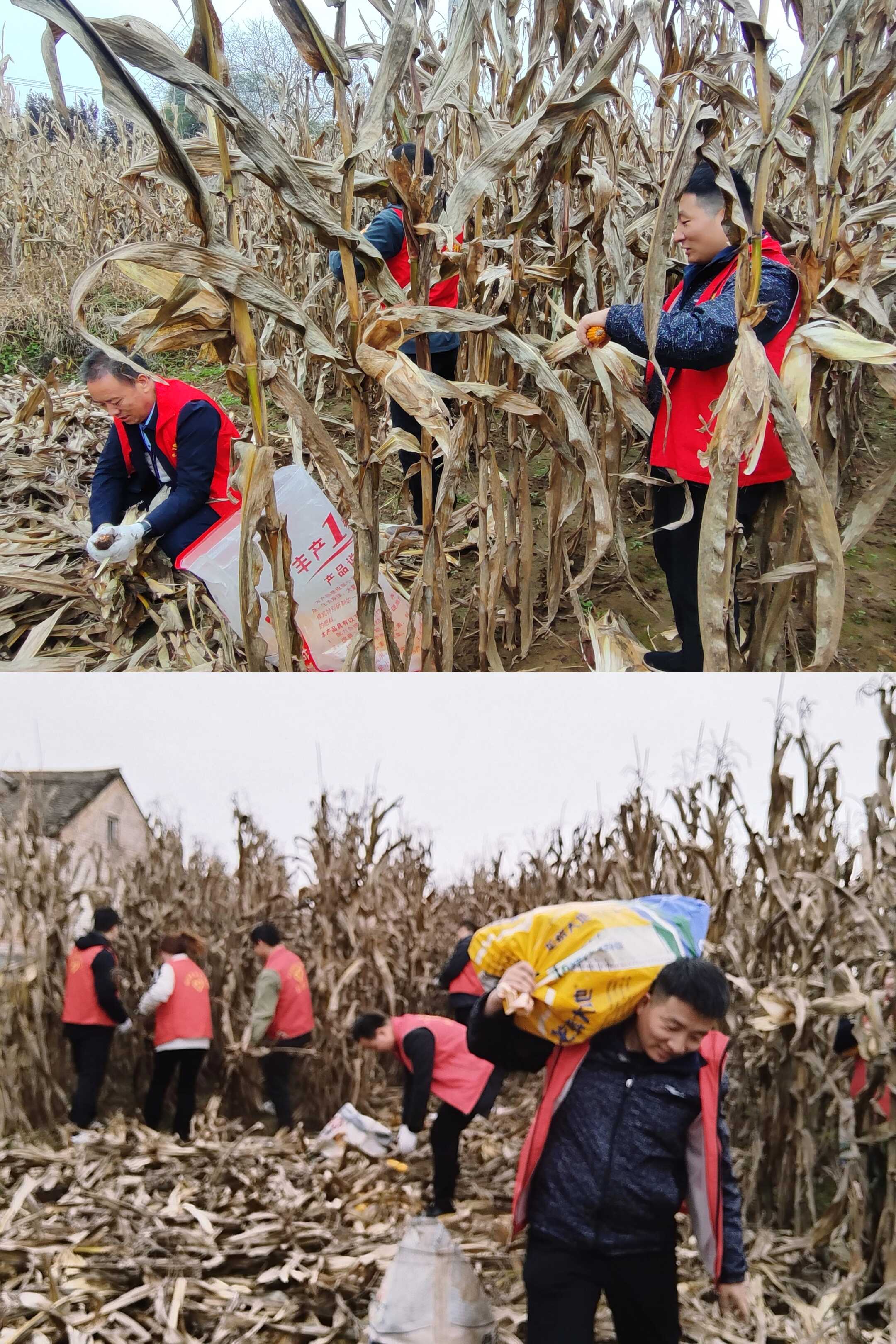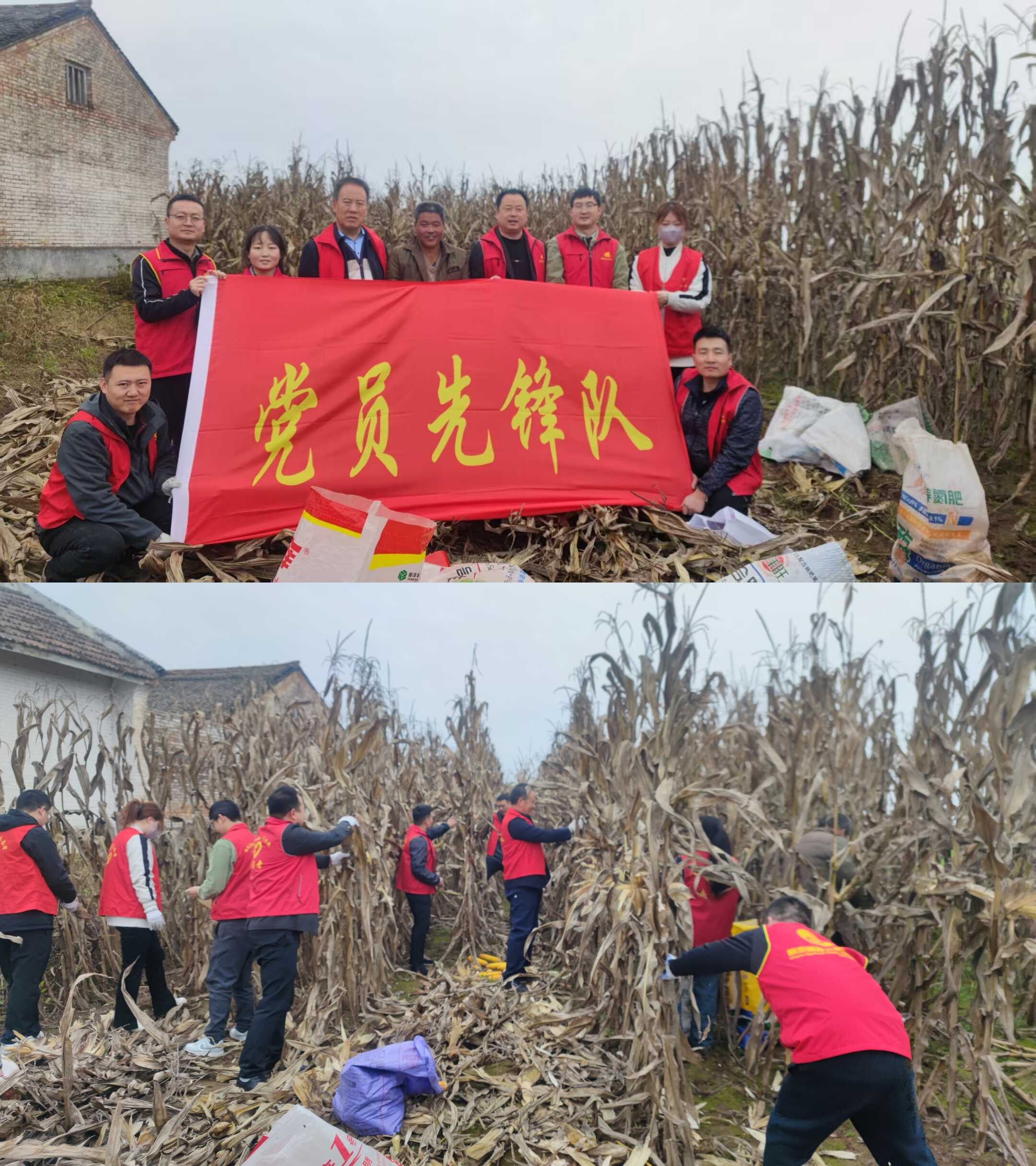 在玉米地里,党员干部迅速投入战斗,分工明确、干劲十足。有的抡起镰刀,剁玉米秆,整齐码放;有的蹲在秆前,掰下玉米棒,装入袋子;有的扛起玉米袋子,运往农用车,现场一片热火朝天的劳动景象,每个人脸上都洋溢着丰收的喜悦。