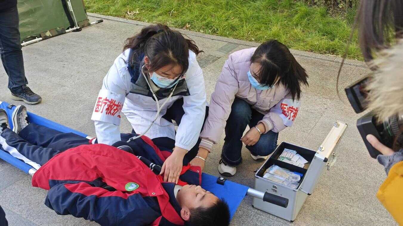 在教学楼模拟火灾现场,灭火行动组早已严阵以待。消防员指导学校后勤人员和教师代表,现场演示灭火器“提拔握压”操作技巧,对准“火源”精准喷射;另一组队员熟练连接消火栓水带,完成初期火灾处置演示。与此同时,医疗救护组在前院医疗点开展应急救治演练,模拟“学生摔倒擦伤”场景,医护人员快速进行止血包扎、担架转运,随后与120急救车完成“重伤员”交接,整个救治流程专业规范。