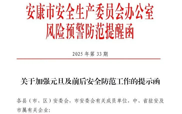 安康市委办、市政府办联合印发《关于做好2026年元旦春节期间有关工作的通知》,对重点时段安全防范工作系统性安排。代市长张小平深入中心城区,实地调研检查安全生产和食品安全工作,层层压实各方责任。市安委办召开全市安全防范重点工作视频调度会,专题部署元旦假期及岁末年初安全防范重点任务;先后印发《关于进一步做好岁末年初安全生产工作的通知》《关于加强元旦及前后安全防范工作的提示函》,靶向施策、精准发力,切实增强工作针对性与预见性。市应急管理局专题召开全市烟花爆竹旺季安全监管及源头管控工作视频会议,细化任务分工,确保责任落到实处。