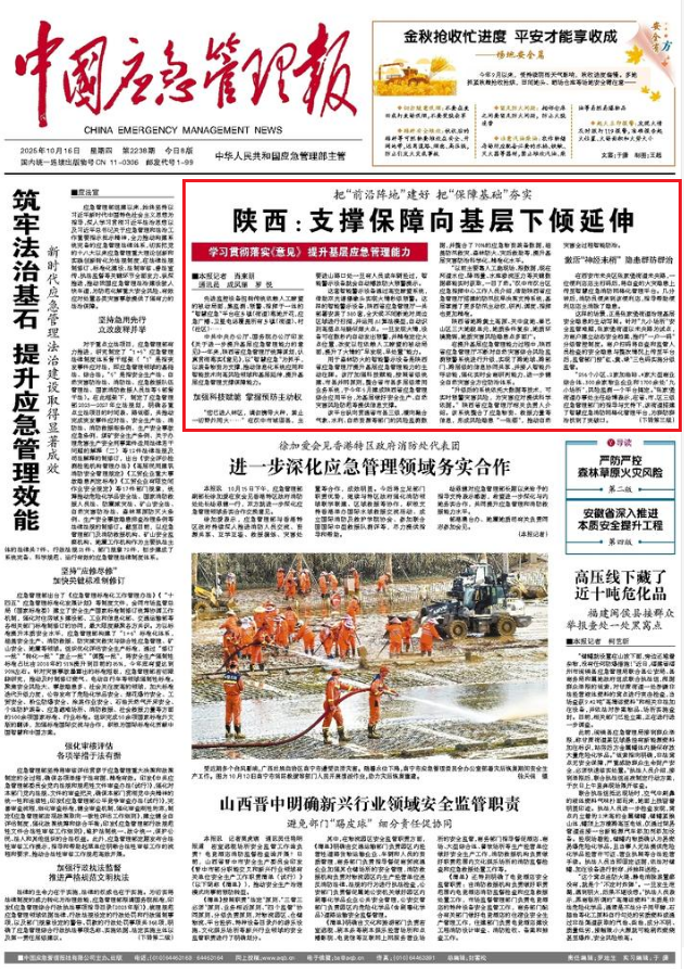 10月16日,中国应急管理报头版以《把“前沿阵地”建好 把“保障基础”夯实 陕西支撑保障向基层